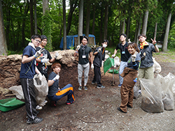 続いて、フィールドワークとして、植樹する苗木の移動やチップ作り等、手際よく準備し、富士山5合目に移動して約400本の苗木を植樹した。